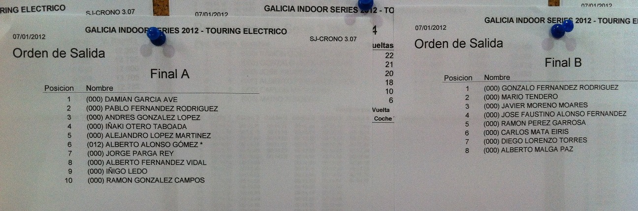 Primera final, salgo muy bien ya que Fran se queda clavado y consigo ponerme sexto en la primera vuelta en la que adelanto a otro mas y me coloco 5 en la segunda, mantengo mi posición hasta la vuelta 12 que tengo un toque contra una barra y el coche queda tocado. Al revisarlo veo que ha doblado un cardan....